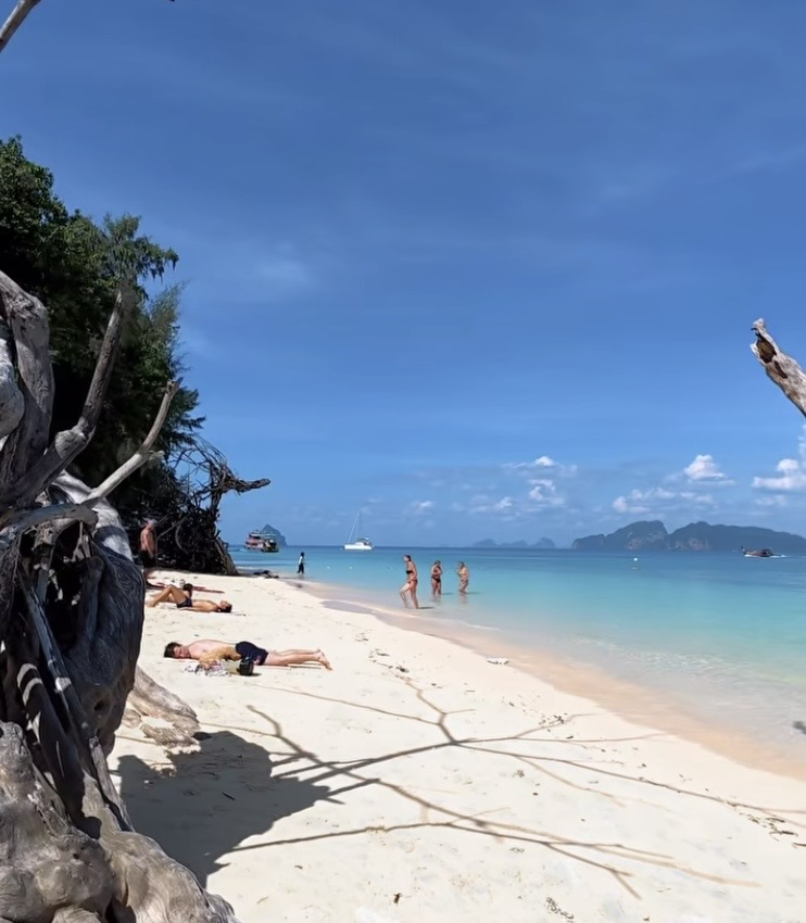 Its crystal-clear waters reveal soft, white sand beneath the surface,